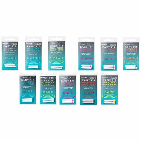 - De Carp Easy Fit Bungee Bushes hebben een standaard 4,7mm buiten diameter met vijf verschillende binnen diameters: Aqua (2,0mm), Groen (2,3mm), Geel (2,6mm), Roze (3,2mm) en Rood (3,5mm).